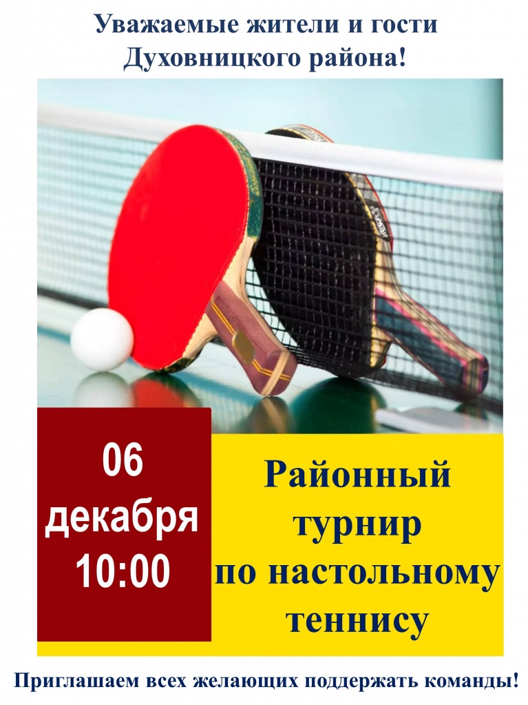 6 декабря 2024 года в 10.00 часов в МОУ «СОШ им В.И. Лаврова с. Горяйновка Духовницкого района» филиал с. Дмитриевка состоится районный турнир по настольному теннису среди трудовых коллективов и учащихся общеобразовательных учреждений, посвященный Дню Героев Отечества и памяти погибших участников специальной военной операции и локальных вооруженных конфликтов.