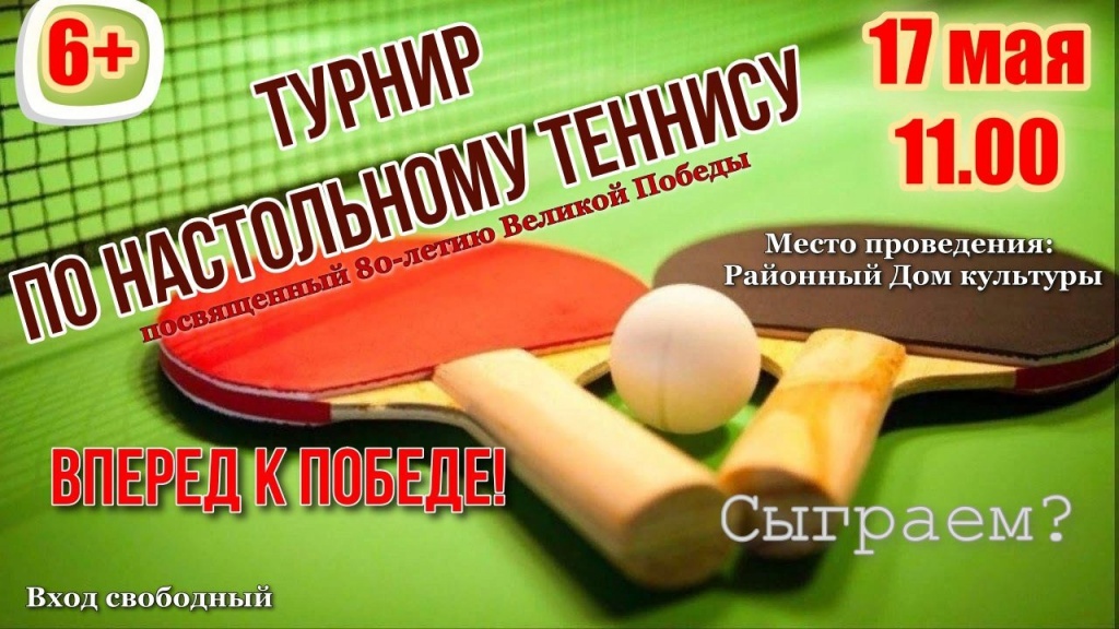Районный Дом культуры приглашает 17 мая в 11.00 состоится турнир по настольному теннису, посвященный 80-летию Великой Победы.