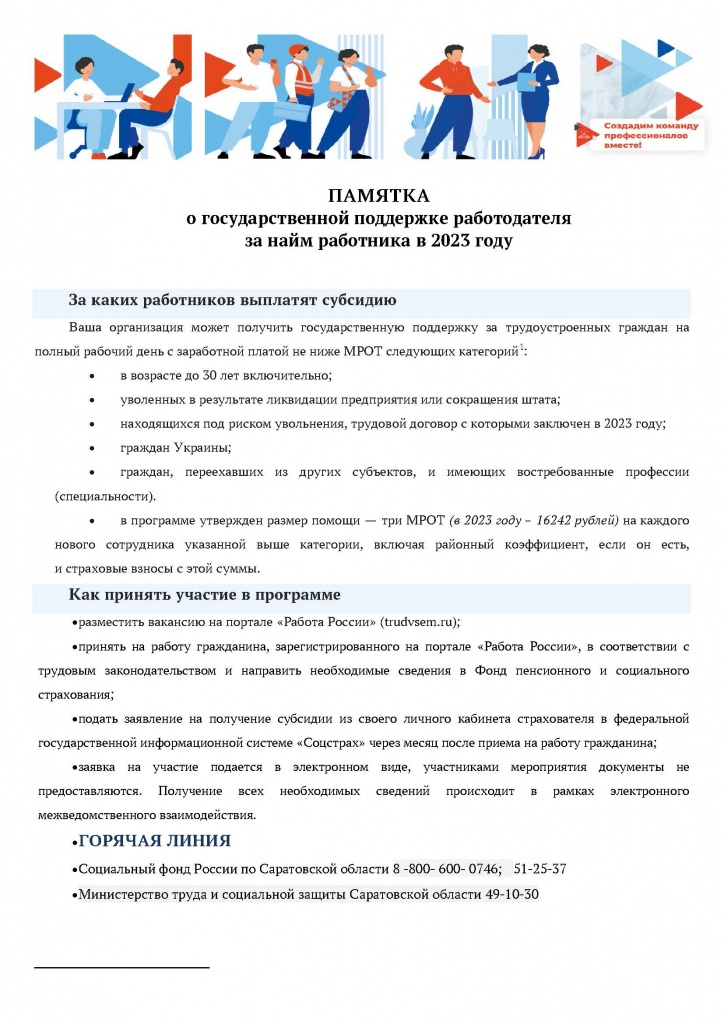 ПАМЯТКА о государственной поддержке работодателя за найм работника в 2023 году