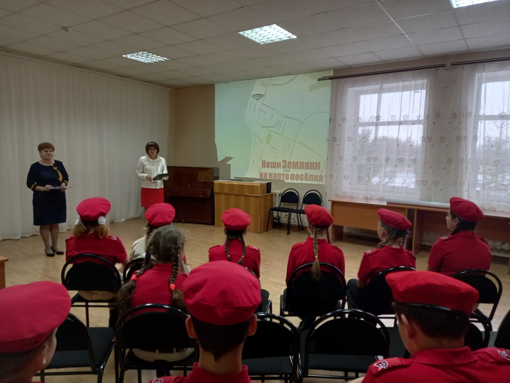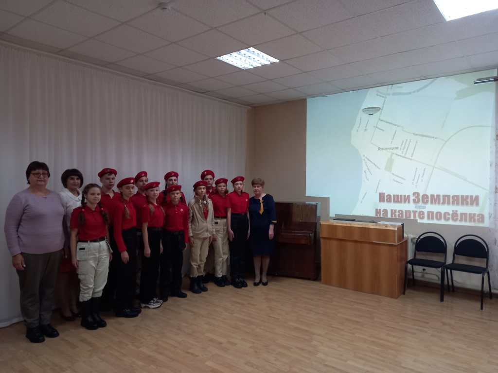 С помощью показа слайдов презентации библиотекари познакомили ребят с героями – земляками участниками Великой Отечественной войны, рассказали об их подвигах и о том, что улицы нашего посёлка и площадь названы их именами. Были зачитаны решения Духовницкого районного совета о переименовании улиц: Южная – Темнова, Восточная – Лаврова, Аэродромная – Вшивцева, Советская – Павлова, которые предоставили работники архива Духовницкого района.