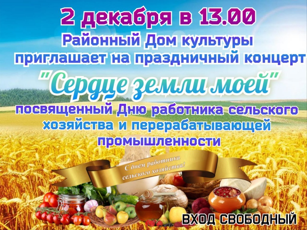 02 декабря 2022 года в 13 часов в здании Районного Дома культуры состоится торжественное мероприятие, посвященное Дню работника сельского хозяйства и перерабатывающей промышленности.