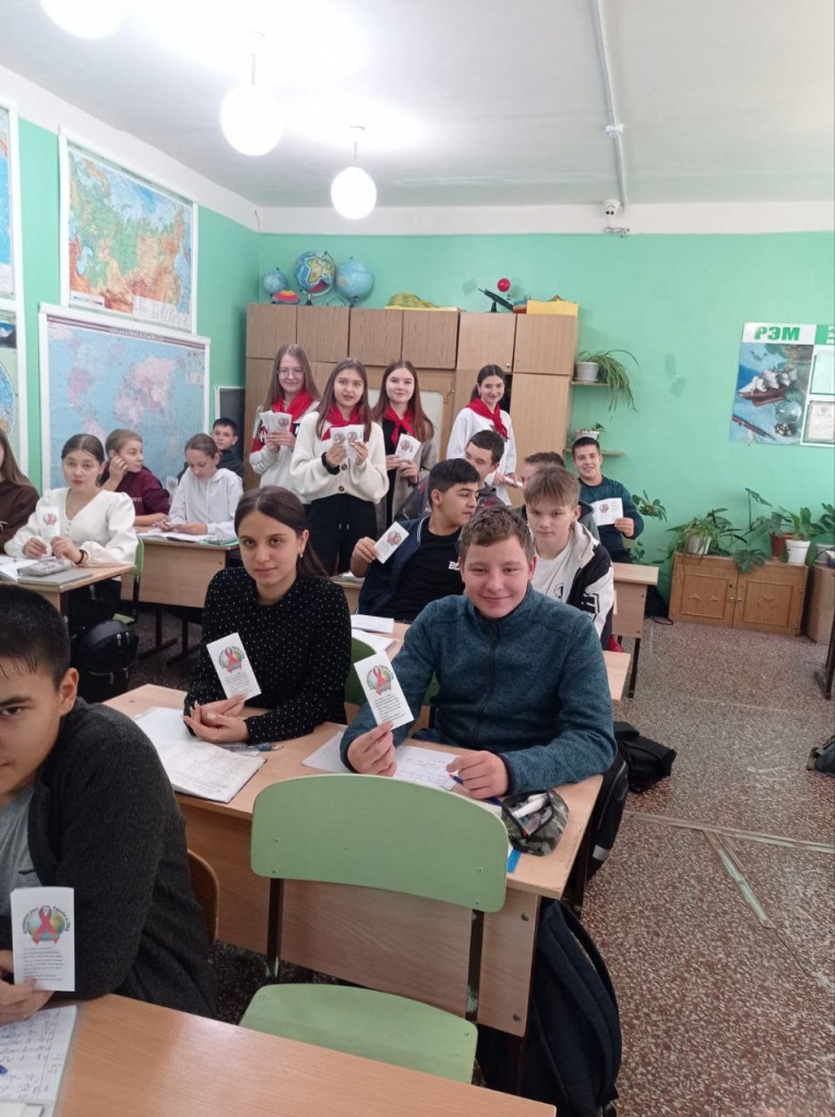 Волонтеры движения "Луч тепла" РДК с руководителем Фёдоровой Г. 1 декабря провели акцию "Мы против СПИДа" и раздали учащимся 8 классов буклеты. Эта акция призывает всех не оставаться равнодушными, ведь это дело каждого из нас.