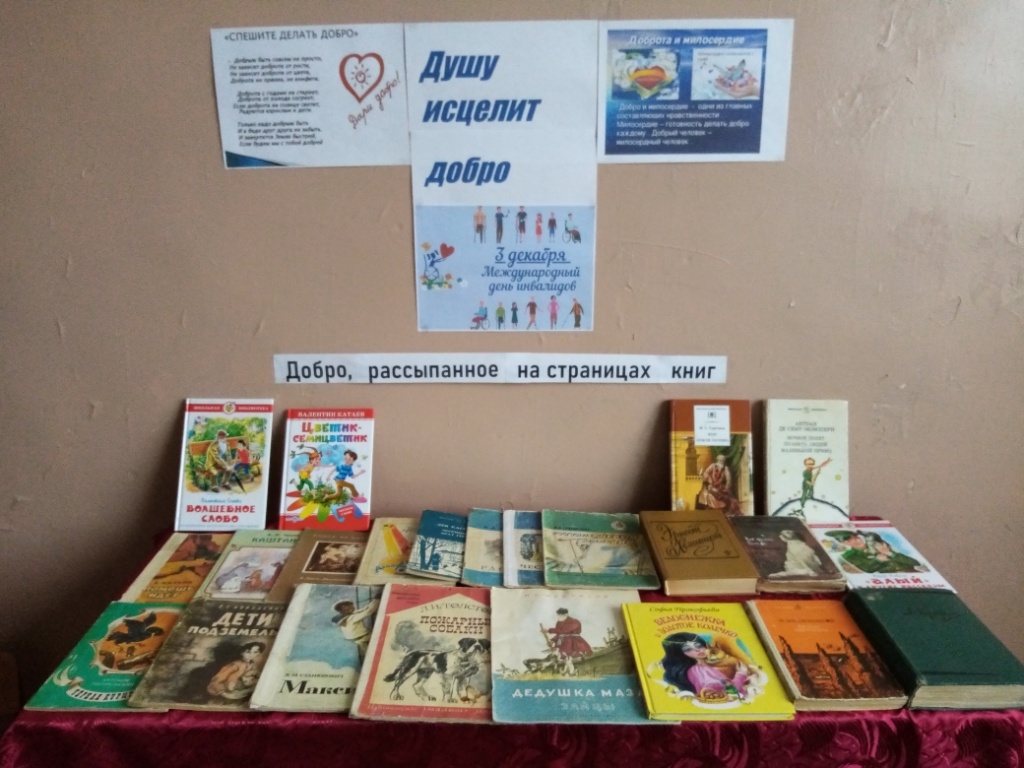 К это дате библиотекарь Брыковского филиала подготовила обзор художественной литературы, для всех категорий читателей "Добро, рассыпанное на страницах книг".На выставке представлены книги авторов: Л. Толстого, В. Железникова, Г. Троепольского и многих других - о доброте, сострадании и любви к ближнему.