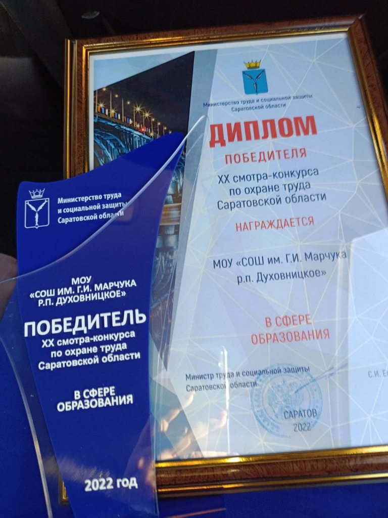 Поздравляем МОУ "СОШ им. Г.И. Марчука р.п. Духовницкое", которая стала победителем XX смотра-конкурса по охране труда в Саратовской области в сфере образования!