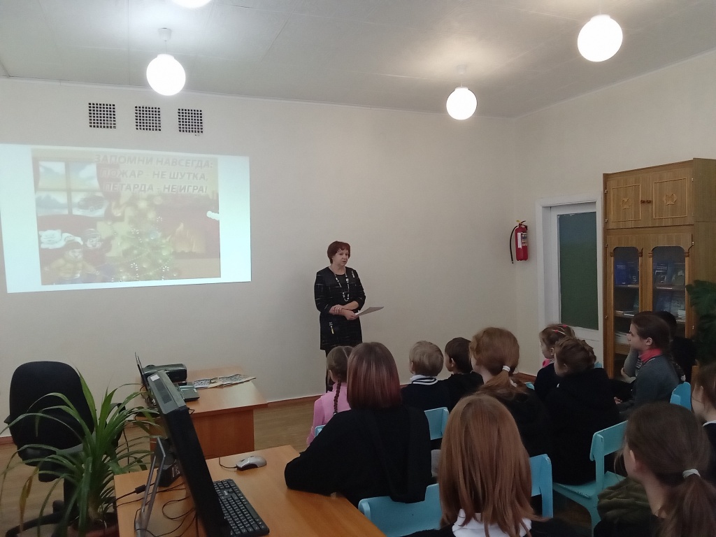 Скоро наступают Новогодние праздники. Для того чтобы праздник ничего не омрачало, надо соблюдать правила безопасности. Библиотекарь предупредила детей, чтобы во время каникул дети не пользовались пиротехникой, т.е. фейерверками, петардами, хлопушками без ведома взрослых. Это опасно для жизни и можно получить увечья.