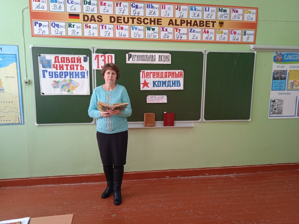 Библиотекарь Долгополова Т.В. провела для учащихся час памяти и мужества «Легендарный комдив», в ходе которого рассказала о биографии замечательного командира, о его боевых заслугах, о подвиге легендарных 28 панфиловцев.