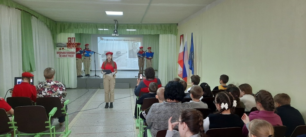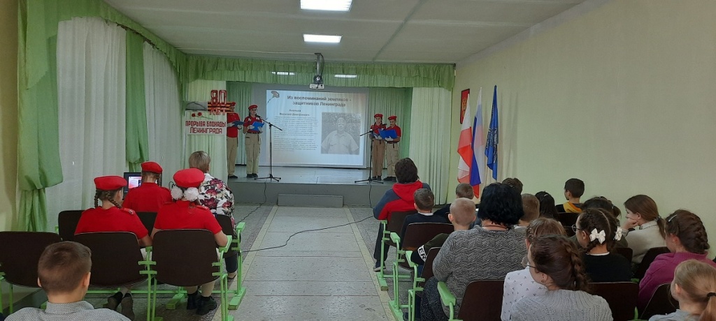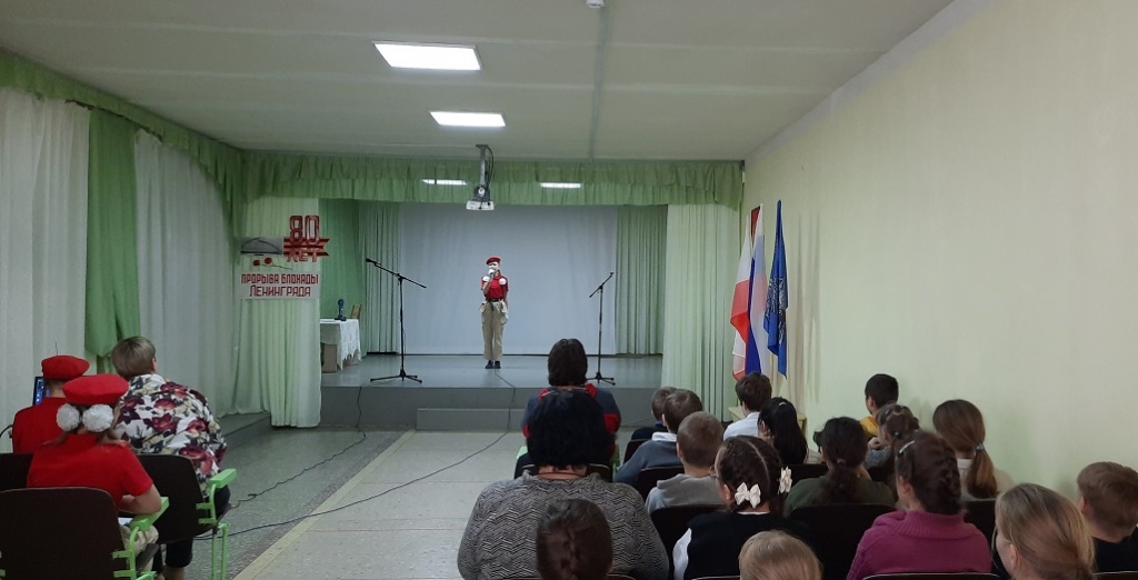 Под таким названием в актовом зале МОУ "СОШ им.Г.И.Марчука р.п.Духовницкое" прошло мероприятие для учеников 4-х классов, посвященное 80-летию прорыва блокады Ленинграда. Его подготовили и провели обучающиеся объединения "Наследие" и юнармейцы 7б класса.