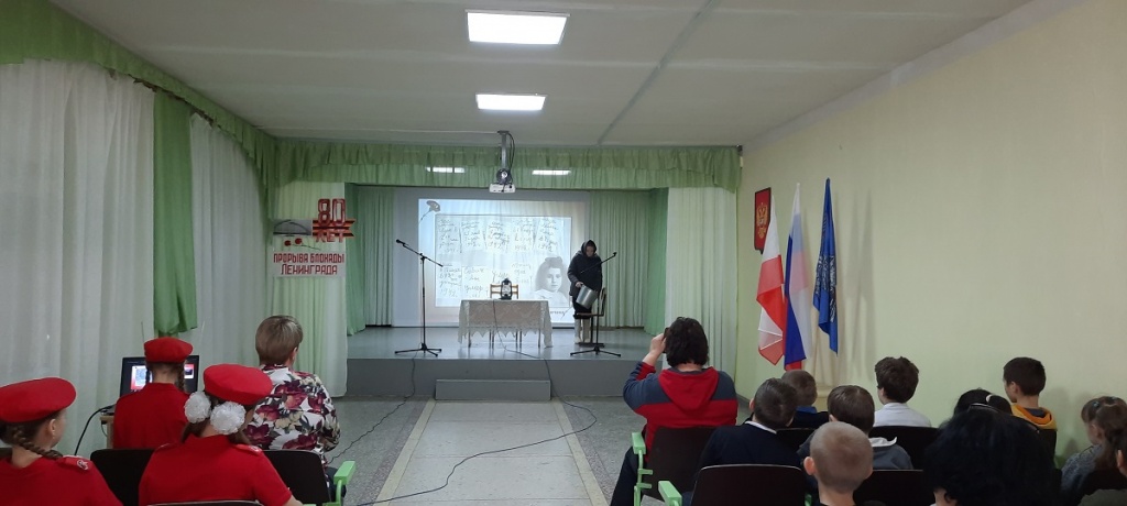 Ребята представили зрителям патриотическую композицию "И победили человек и город!", построенную на воспоминаниях наших земляков, ветеранов Великой Отечественной войны - участников освобождения г.Ленинграда от фашистской блокады: Сафонова Алексея Афанасьевича, Гуляева Анатолия Иосифовича, Сапожникова Александра Михайловича, Ануфриева Григория Родионовича. Также, ведущие мероприятия продемонстрировали видеоролик "Дневник Тани Савичевой", инсценировали стихотворение А.Гуркова "Девочка из блокадного Ленинграда", исполнили песни "Ленинградские мальчишки" и "Дети войны".