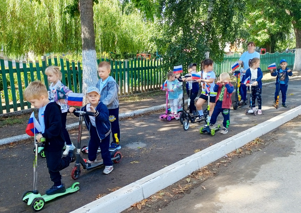 Весёлые соревнования на самокатах с флагами нашей страны стали настоящим праздником для ребят. Дети с удовольствием участвовали в эстафете, где нужно было проехать на самокате, держа в руках российский триколор.