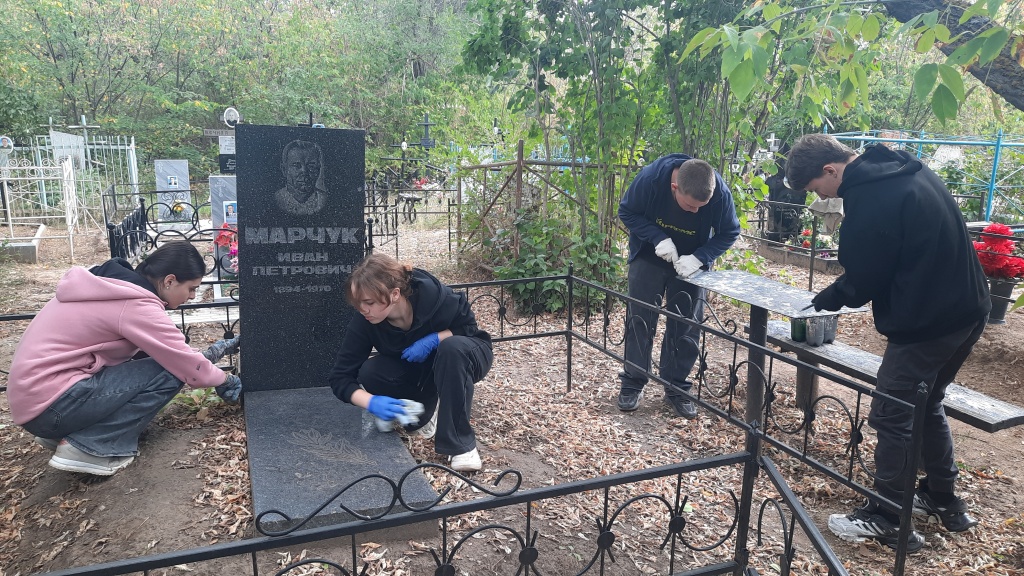 Недавно обучающиеся 10 класса Брежнева Д., Фаталиева Г., Апполонов А. и Кочетков В. навели порядок на могиле отца Гурия Ивановича, И. П. Марчука, который много лет работал в нашей школе учителем химии, биологии, был завучем, награжден орденом «Трудового Красного Знамени».