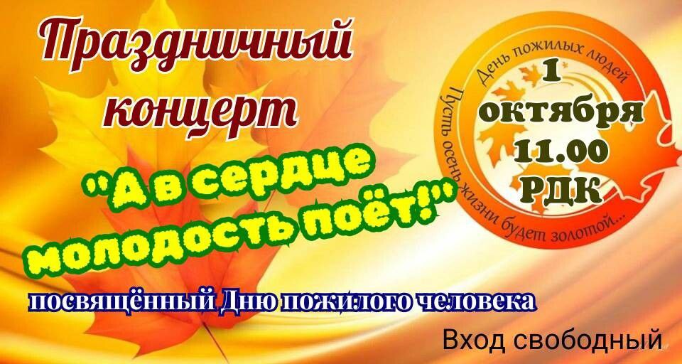 Районный Дом культуры приглашает 1 октября в 11.00 на Праздничный концерт "А в сердце молодость поет!", посвященный Дню пожилого человека.