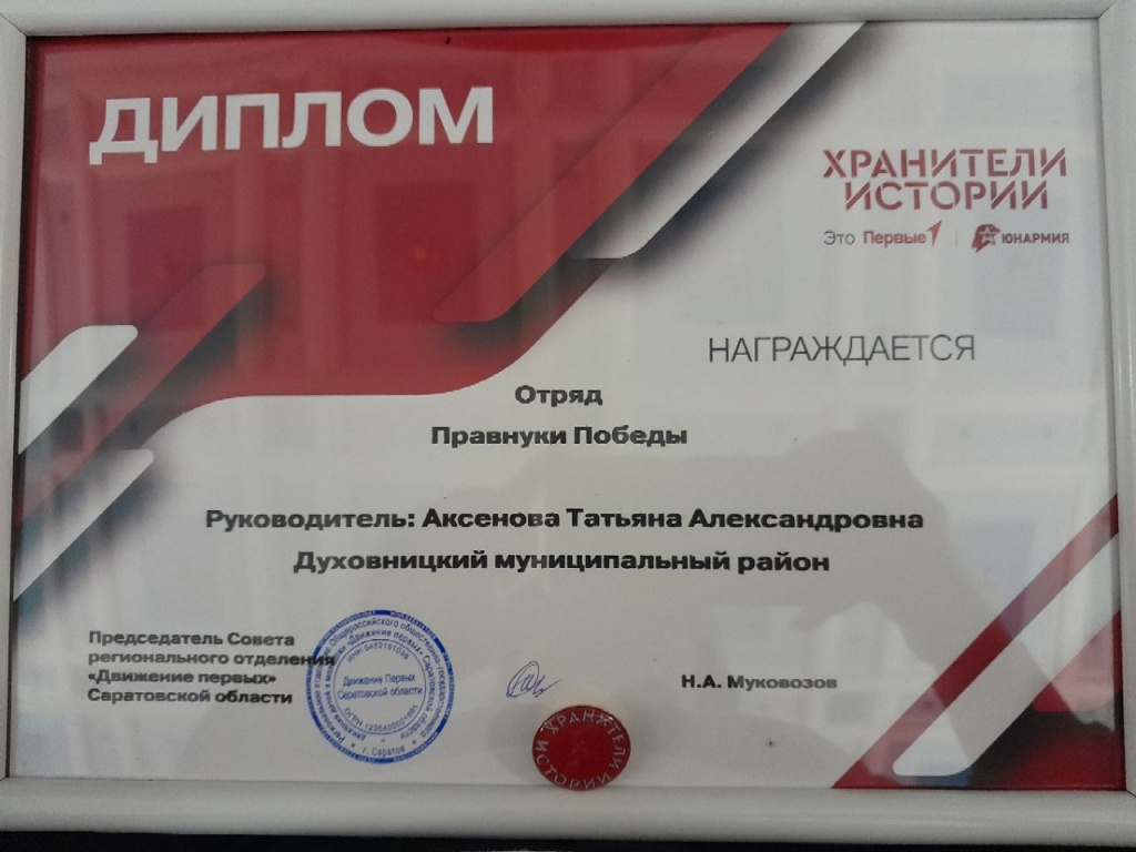 Особую гордость вызывает то, что честь представлять наш родной Духовницкий район выпала команде «Правнуки Победы» из 6 А класса школы имени Г.И. Марчука поселка Духовницкого. Под чутким руководством учителя Т. А. Аксеновой ребята активно участвовали во всех мероприятиях этого яркого события.