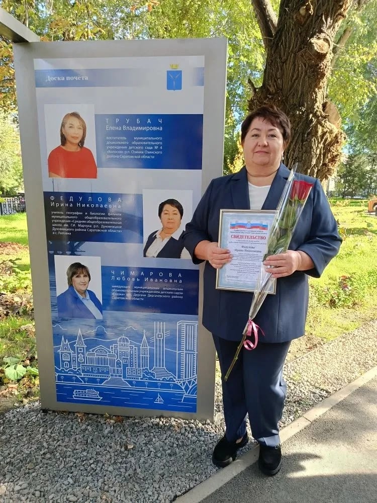 Ещё в нашей школе произошло очень значимое событие, которое переполняло всех особой гордостью, потому что на Доску почёта работников образования Саратовской области занесено имя Федуловой Ирины Николаевны, учителя-наставника филиала МОУ «СОШ им. Г.И. Марчука р.п. Духовницкое» в с. Липовка.