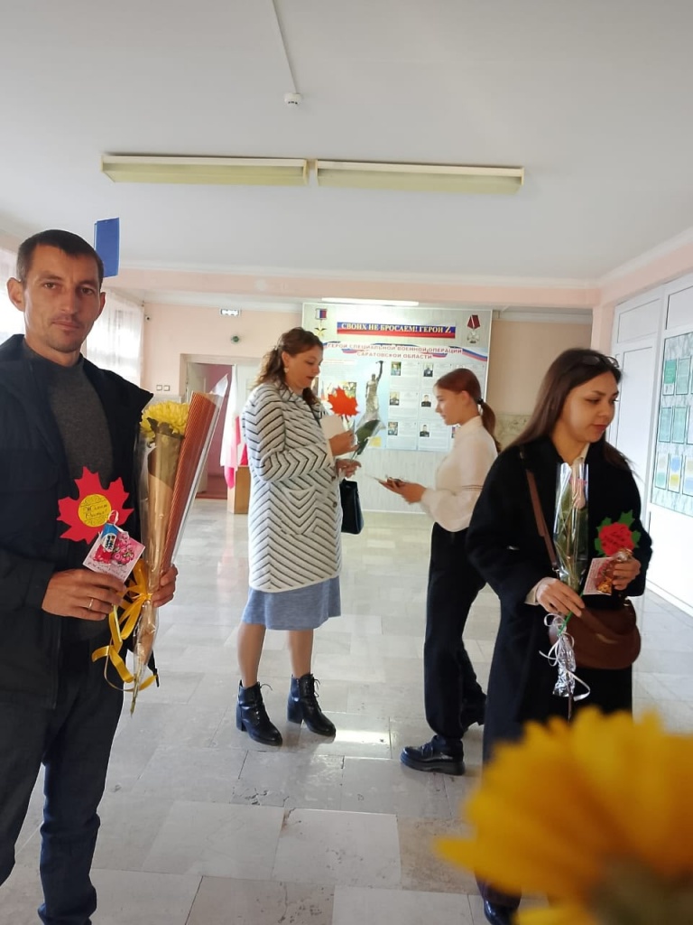 И как отрадно видеть, что с самого утра вокруг царит праздничная атмосфера. В школе звучат песни, а на входе любимых педагогов встречают ребята с цветами и поздравлениями.