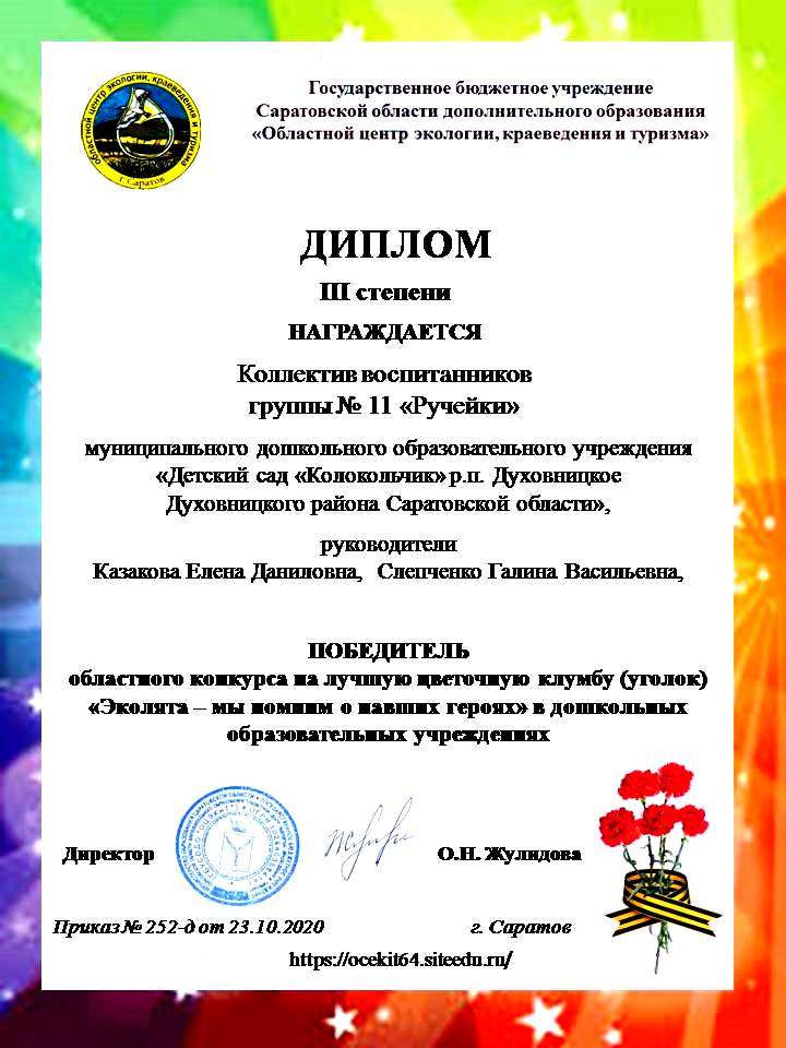 В этом году МДОУ "Детский сад "Колокольчик" р.п. Духовницкое Саратовской области" принимал участие в Областном конкурсе на лучшую цветочную клумбу (уголок) «Эколята – мы помним о павших героях» в дошкольных образовательных учреждениях, посвященный 75-летию Победы в Великой Отечественной войне (март - ноябрь 2020 г.).