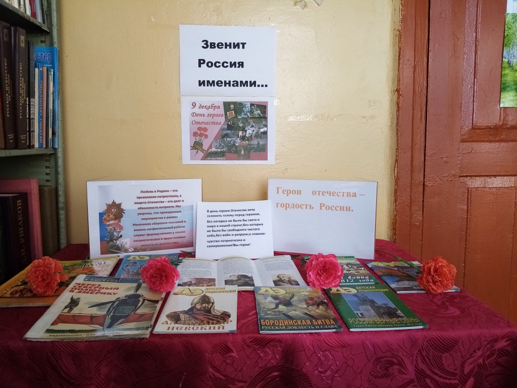 9 декабря наша страна отмечает День героев Отечества. Эта памятная дата в нашей стране была установлена в 2007 году. Россияне, отмеченные почетным званием героев достойны, чтобы у них был собственный праздник!День 9 декабря был выбран не случайно. В истории нашего Отечества эта дата имела особое значение. По преданию, именно 9 декабря святой Георгий Победоносец, почитаемый на Руси как покровитель русского воинства, одержал победу над змеем. Императрица Екатерина II в 1769 году учредила орден Святого Георгия Победоносца.К этому событию в Брыковском филиале библиотеке оформлена книжная выставка «Звенит Россия именами», на которой представлены книги о героях нашего Отечества с древних времен по настоящее время. Александр Невский, Александр Суворов, Михаил Кутузов, Георгий Жуков- вот лишь имена некоторых героев, которые прославили нашу Родину и мы по праву ими гордимся.