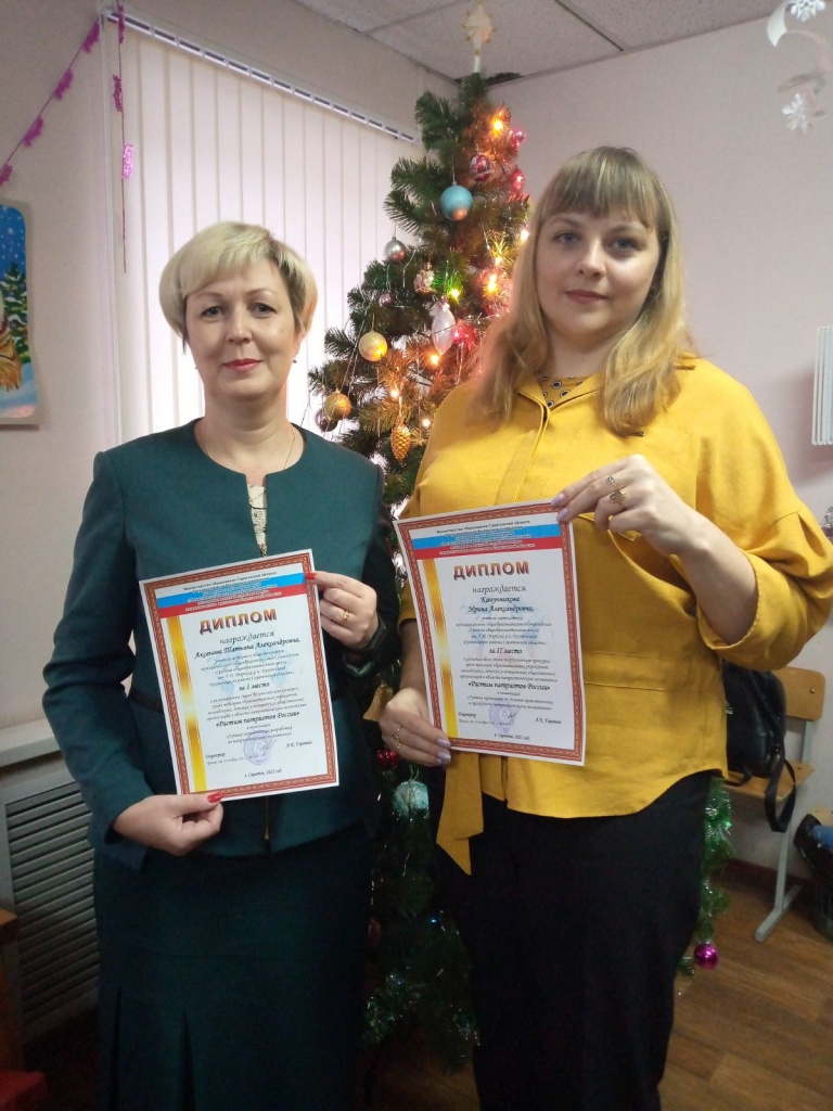 С 1 октября по 15 ноября 2021 года в Саратовской области проводился региональный этап Всероссийского конкурса среди педагогов образовательных учреждений, молодёжных, детских и ветеранских общественных организаций в области патриотического воспитания «Растим патриотов России». Конкурс проводился по 3 номинациям: 1. «Лучшая программа по духовно-нравственному и гражданско-патриотическому воспитанию» 2. «Лучшая методическая разработка по патриотическому воспитанию» 3. «Лучшие практики организации дистанционной работы по патриотическому воспитанию с использованием мультимедийных технологий» Всего на конкурс было представлено 90 работ. 9.12.2021 г. в День Героев Отечества в Региональном центре допризывной подготовки молодёжи к военной службе и военно-патриотического воспитания Саратовской области состоялось торжественное награждение победителей и призёров конкурса. Среди награждаемых были педагоги МОУ «СОШ им. Г.И. Марчука р.п. Духовницкое»: - Аксенова Татьяна Александровна, занявшая 1 место в номинации «Лучшая методическая разработка по патриотическому воспитанию»; - Канунникова Ирина Александровна, занявшая 2 место в номинации «Лучшая программа по духовно-нравственному и гражданско-патриотическому воспитанию». Поздравляем! Так держать!!!