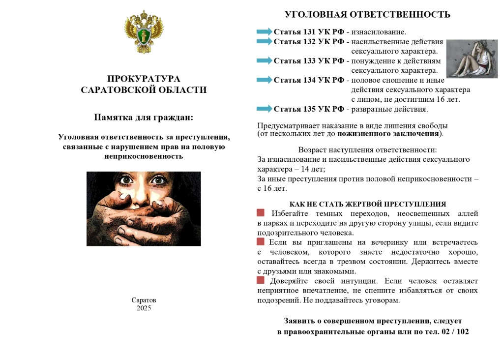 Прокуратурой Саратовской области разработана памятка с разъяснением законодательства об уголовной ответственности за преступления, связанные с нарушением прав на половую неприкосновенность.